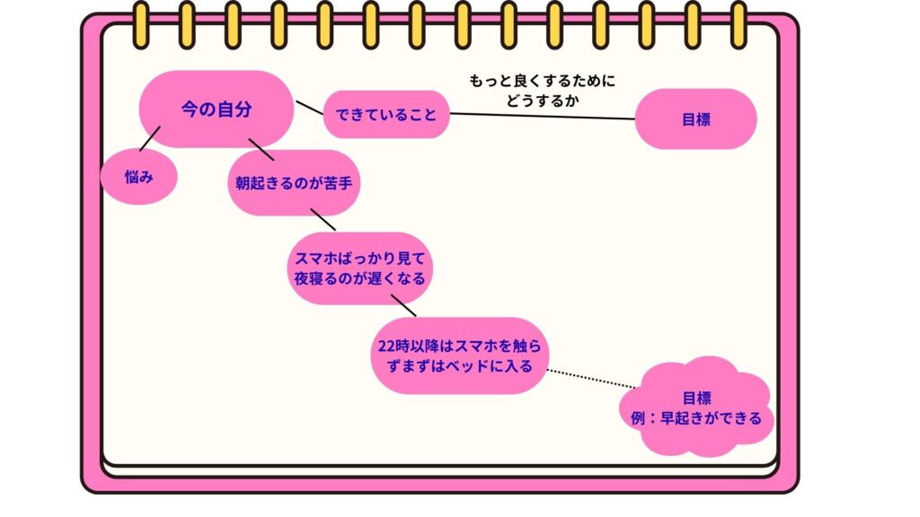 ④書いてきたことを見返してどういう風になりたいかを目標として書く(目標の完成) ※目標を先に端っこに書いてその目標を達成するためにはどうしていくべきか逆算して書く方法でもOK!